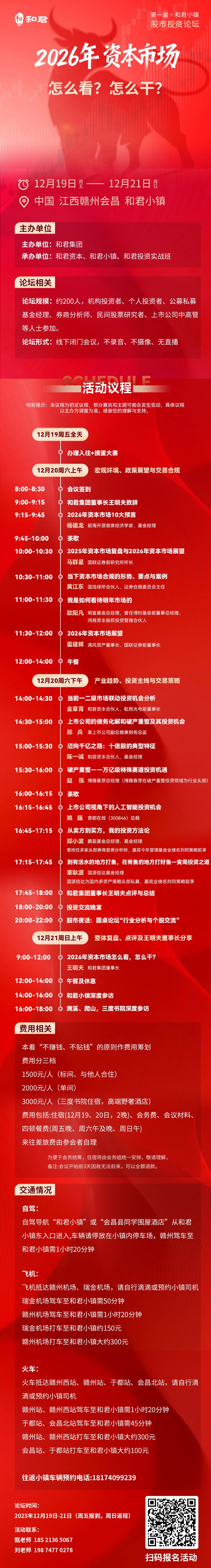 和君小镇股市投资论坛将于12月20日至21日举行,汇聚近200位资深投资人。和君集团董事长王明夫领衔,首席经济学家、基金经理、超级牛散等十多位嘉宾将深度分享宏观展望、产业趋势与实战策略。线下闭门,深度交流,共探2026年市场机遇。